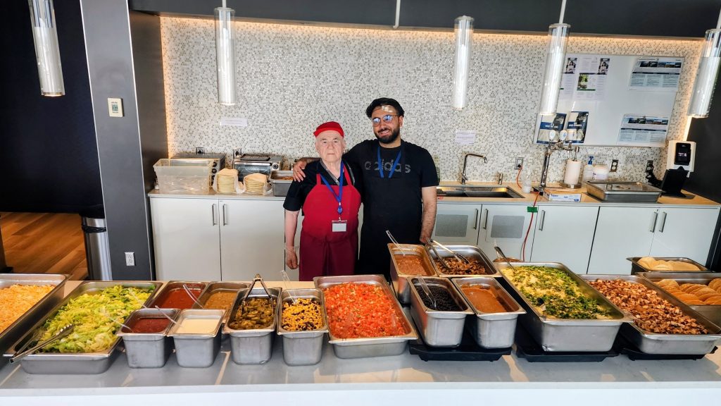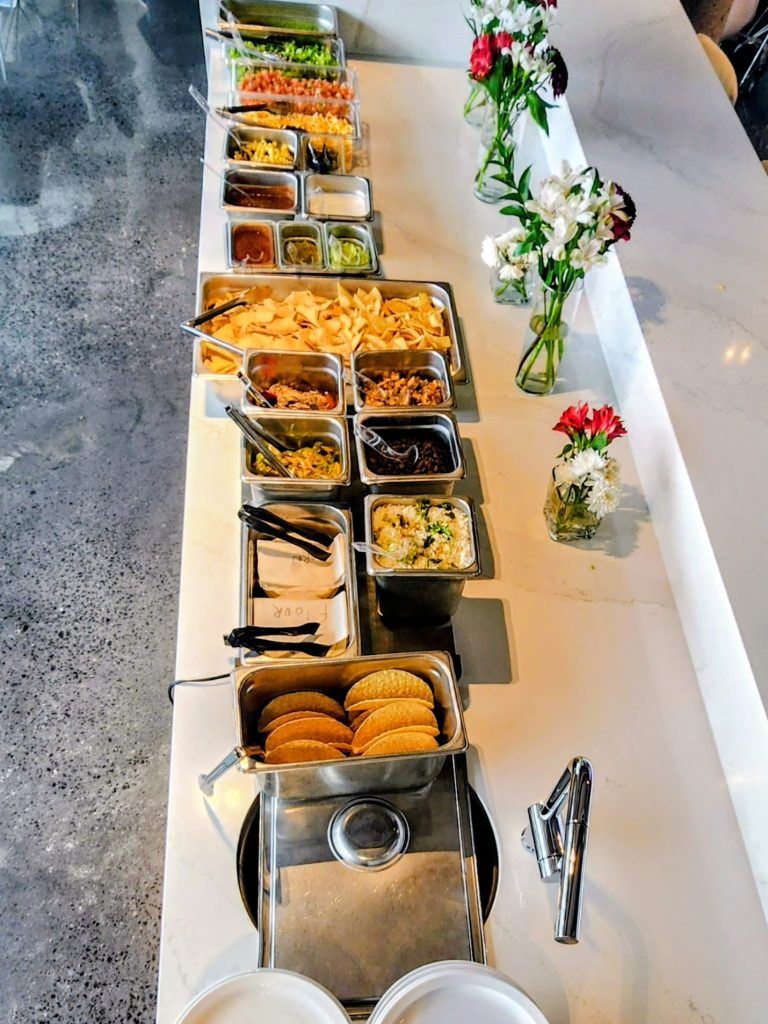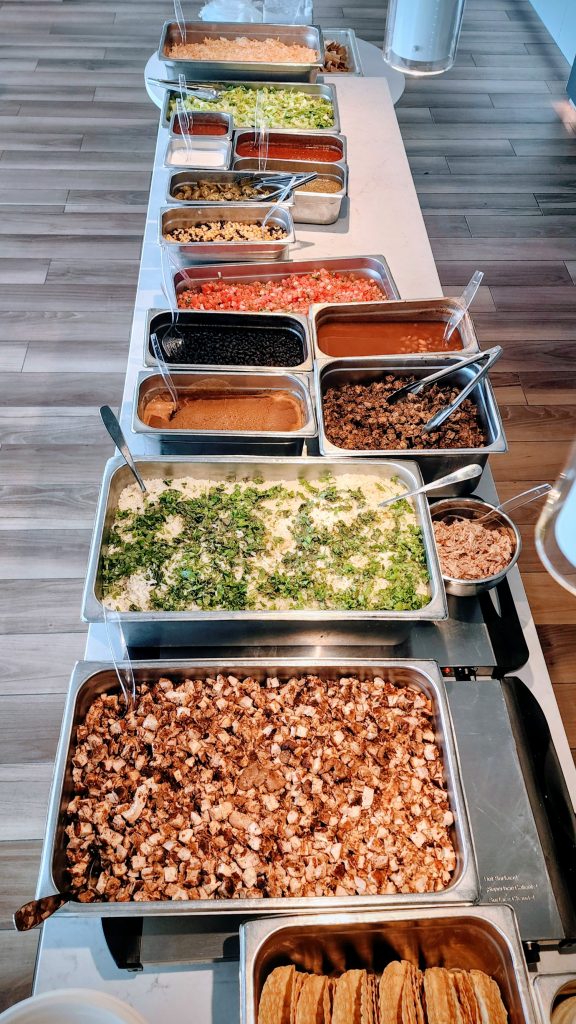 As seen in the photo above. Comes with Corn (gluten-free) & flour taco tortillas, choices of fillings (vegetarian, chicken, beef, pork, or steak), choice of beans (refried, pinto, or black), cilantro lime rice, sautéed fajita peppers and onions, mix of homemade salsas, sour cream, grated cheese, lettuce.